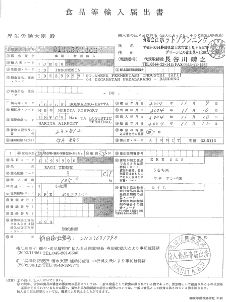 (有)ホットプランニング〜(有)まるさ食品 食品等輸入届出書/b>